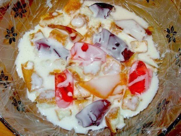 5. Салатник выстелить пленкой и в хаотичном порядке накидываем: кусочки ломанного бисквита и чайной ложечкой кусочки желе разного цвета.Каждый слой поливаем сметанным кремом и так далее.
