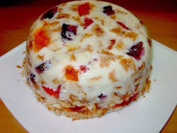 8. Поставить в холодильник, чтобы застыл сметанный крем (у меня получилось за 3 часа). Затем: Прижать салатник широким блюдом, перевернуть, снять салатник и аккуратно отлепить пленку.