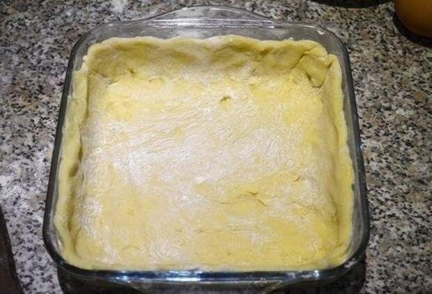 Раскатываем тесто по размеру формы для выпечки и аккуратно переносим его в смазанную маслом форму.