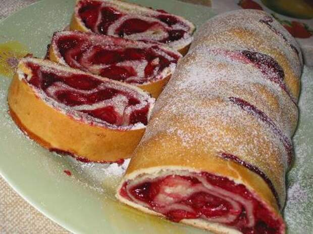 4. Духовку нагреть на 210 градусов,выпекать штрудель 30 минут.Затем переложить на решетку остывать и прикрыть ненадолго полотенцем.Порезать,можно посыпать сахарной пудрой. Так же можно и с яблоками приготовить,яблоки порезать дольками,уложить на пласт,посыпать сахаром и корицей и молотыми сухарями.