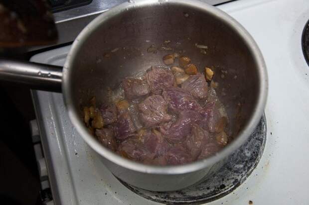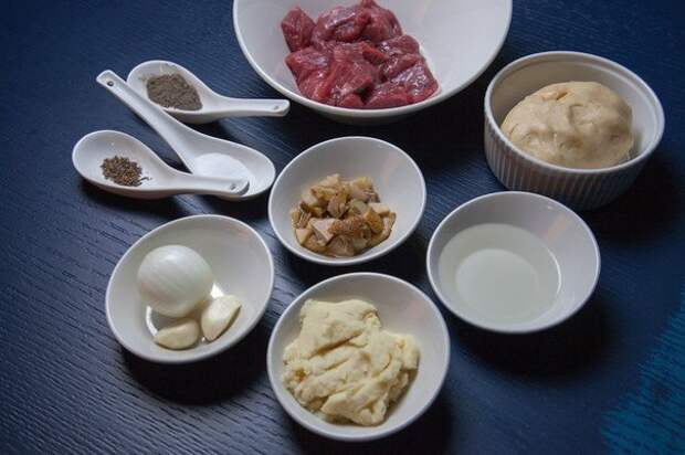 1. Подготовить ингредиенты. Мясо нарезать кубиками среднего размера. Нарезать грибы.