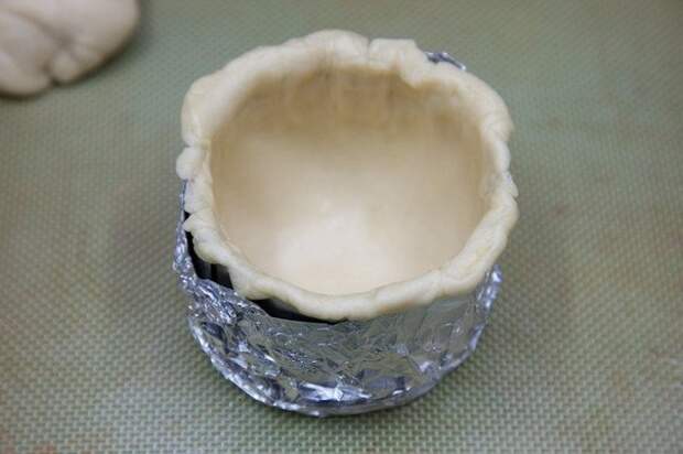 7. Приготовить песочное тесто. На керамическую форму раскатать тесто (125 г теста, объем формы – 300 мл) и запечь в разогретой до 170 градусов духовке 14 минут.