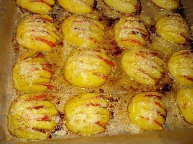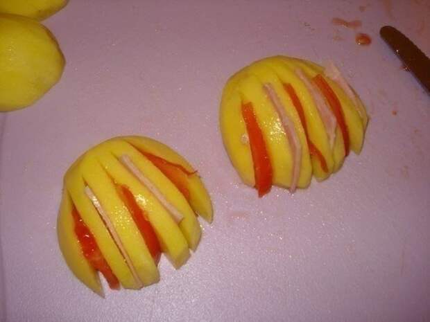 4. В картошку в каждый надрез чередуя положить кусочек ветчины и помидора. Затем посолить и поперчить.