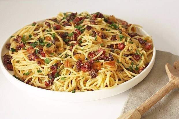 Добавьте макароны в сковороду с грудинкой, хорошенько перемешайте. Приправьте сверху солью и черным молотым перцем. Да побольше.