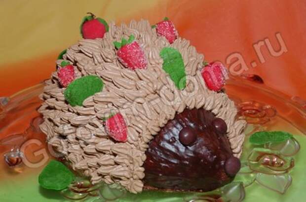 На спинку ежика можно положить: ягоды из варенья или свежие ягоды вишни и клубники; половинки грецких орехов, выпеченные маленькие грибочки или яблочки и т.п.