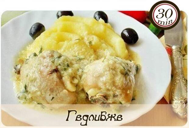 Гедлибже — блюдо кабардинской кухни. Очень простое, сытное и вкусное во многом благодаря изумительному соусу из жареного лука и сметаны. Гедлибже готовят по разному: кто-то кладет больше сметаны, кто-то меньше. Неизменным остается его состав — курица, сметана и лук. В большинстве рецептов лук просто обжаривается.