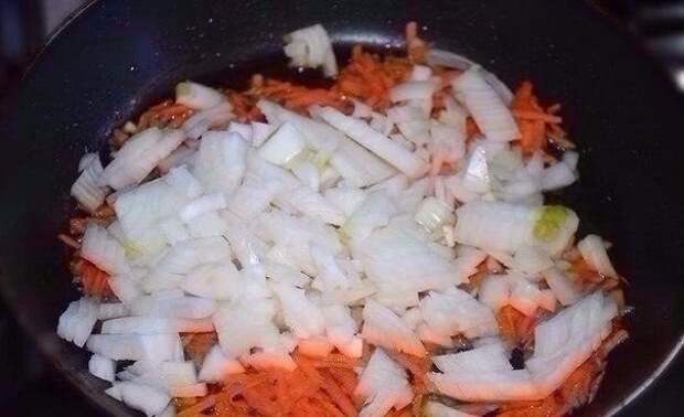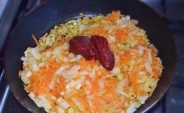 3. Морковь натереть на тёрке. Лук нарезать кубиками среднего размера. Выложить в сковороду с растительным маслом. Лук и морковь обжарить 10 минут. Затем к овощам добавить томатную пасту. Тушить вместе с томатной пастой 5-10 минут.