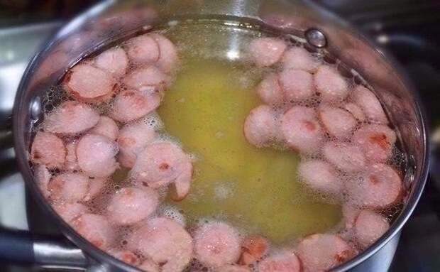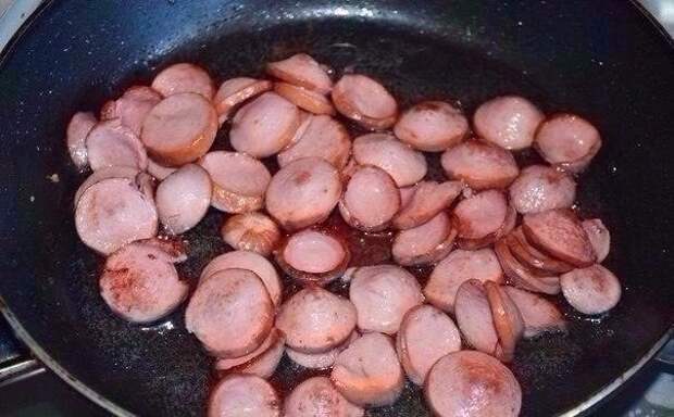 2. Сосиски нарезать кружочками. Обжарить на растительном масле. Затем обжаренные кружочки сосисок переложить в кастрюлю с картофелем.