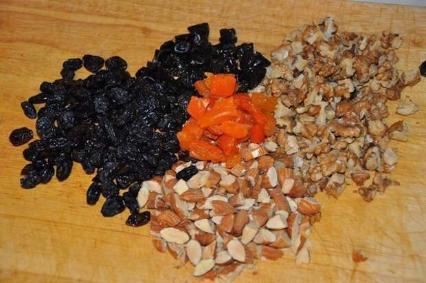 2. Добавить измельченные курагу, изюм и миндаль. Перемешать. Скатать из теста батончики и разложить их на противне на небольшом расстоянии. Батоны теста слегка прижать и выпекать 30 минут до зарумянивания.