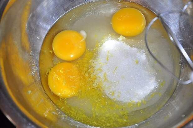 1. Разогреть духовку до 180-190°C. Взбить яйца с сахаром в пышную светлую массу. Порциями добавлять муку, каждый раз тщательно перемешивая.