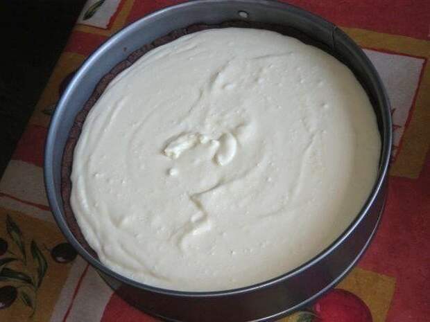 Начинка: Взбить творог + масло с сахаром и ванилином. Добавить крахмал. По одному добавлять яйца, перемешивая и затем взбивать минимально продолжительное время, лишь, чтобы яйца полностью вмешались. Вылить начинку на тесто.
