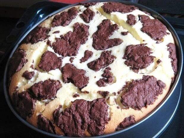 Тесто: Масло растереть с сахаром, добавить все остальные продукты по списку, тщательно вымешивая. Распределить руками тесто по дну и стенкам формы, оставив небольшой кусочек теста на пятнышки для коровки!