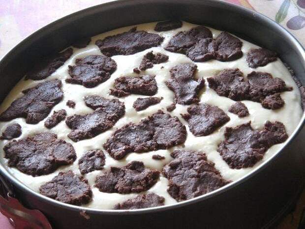 Далее из оставшегося кусочка теста формируем произвольные лепешки-пятнышки и распределяем их поверх творога. Ставим в разогретую до 170 градусов духовку на 50 мин.