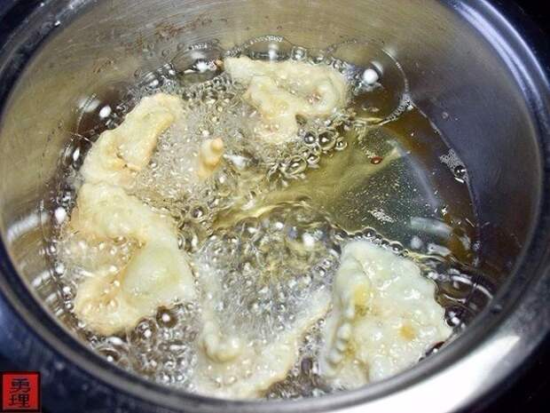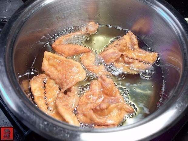4. В середине ромба или полоски прорезать щель и свернуть изделие, чтобы было красиво. Разогреть масло в кастрюльке и опустить туда 3-4 штуки ромбов. Огонь под маслом сделать небольшой, т.к. можно вполне упустить момент и хворост пережарится.