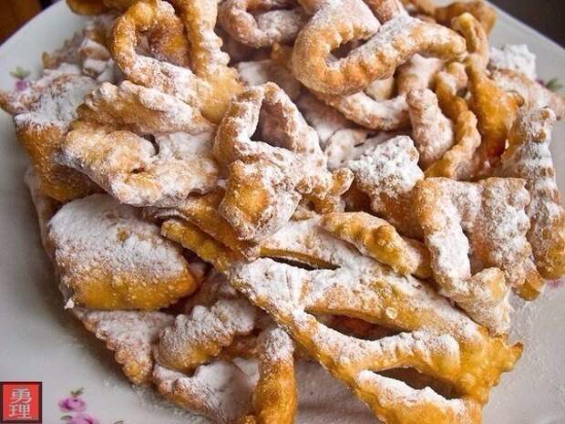 5. Как только нижняя часть покоричневеет, перевернуть хворост и дожаривать примерно одну минуту до такого цвета. Выложить на бумажную салфетку или полотенце - чтобы впитался излишек жира. Таким образом поступить и с остальным тестом. Разложить на блюде, пересыпая щедро сахарной пудрой.
