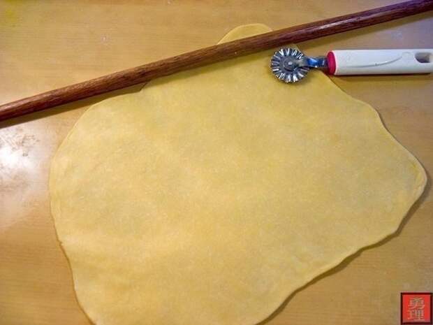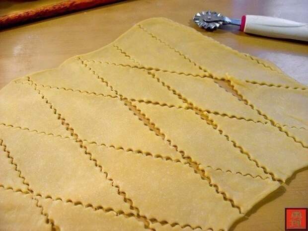 3. Оставшуюся часть теста спрятать в мешок, чтобы не высыхало. Фигурным ножом разрезать тесто на ромбы или полоски. Если нет фигурного - резать обычным - на вкус не влияет.
