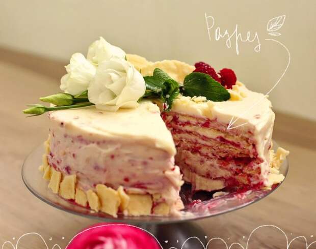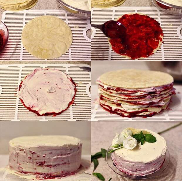 4. В сборке торт прост — смазать малиновым сиропом корж, затем распределить крем и так до тех пор ,пока коржи не закончатся)